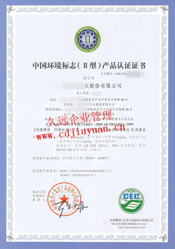 中國環(huán)境標(biāo)志產(chǎn)品II型認(rèn)證證書(十環(huán)II型)