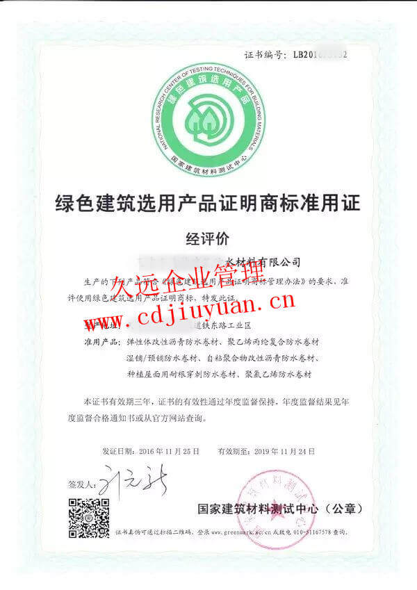綠色建筑選用產(chǎn)品認(rèn)證證書